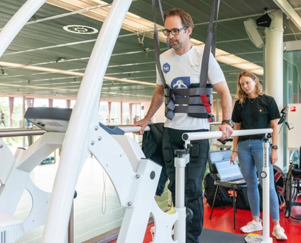 In deze studie volgen deelnemers drie verschillende vormen van looptraining:1) Conventionele looptraining zonder extra stimulatie; 2) Looptraining met FES; en 3) Looptraining met FES én tSCS. De deelnemers trainen twee keer per week, 30 minuten per sessie, op een speciale loopband met een veiligheidsharnas. Tijdens de training worden de spieren gestimuleerd met het Teslasuit, een pak dat elektrische prikkels afgeeft aan de beenspieren. Bij de groep die ook tSCS krijgt, wordt daarnaast milde stroom toegediend via elektrodes op de huid van de rug, met behulp van het LIFT-apparaat van ONWARD Medical. De studie duurt in totaal 33 weken. We meten de effecten op vier momenten: vóór de training, na de conventionele training, na de FES- of FES+tSCS-training, en tien weken later. We kijken dan naar loopsnelheid, spieractiviteit, spierkracht en hoe stabiel iemand loopt – zowel op de loopband als op de grond.